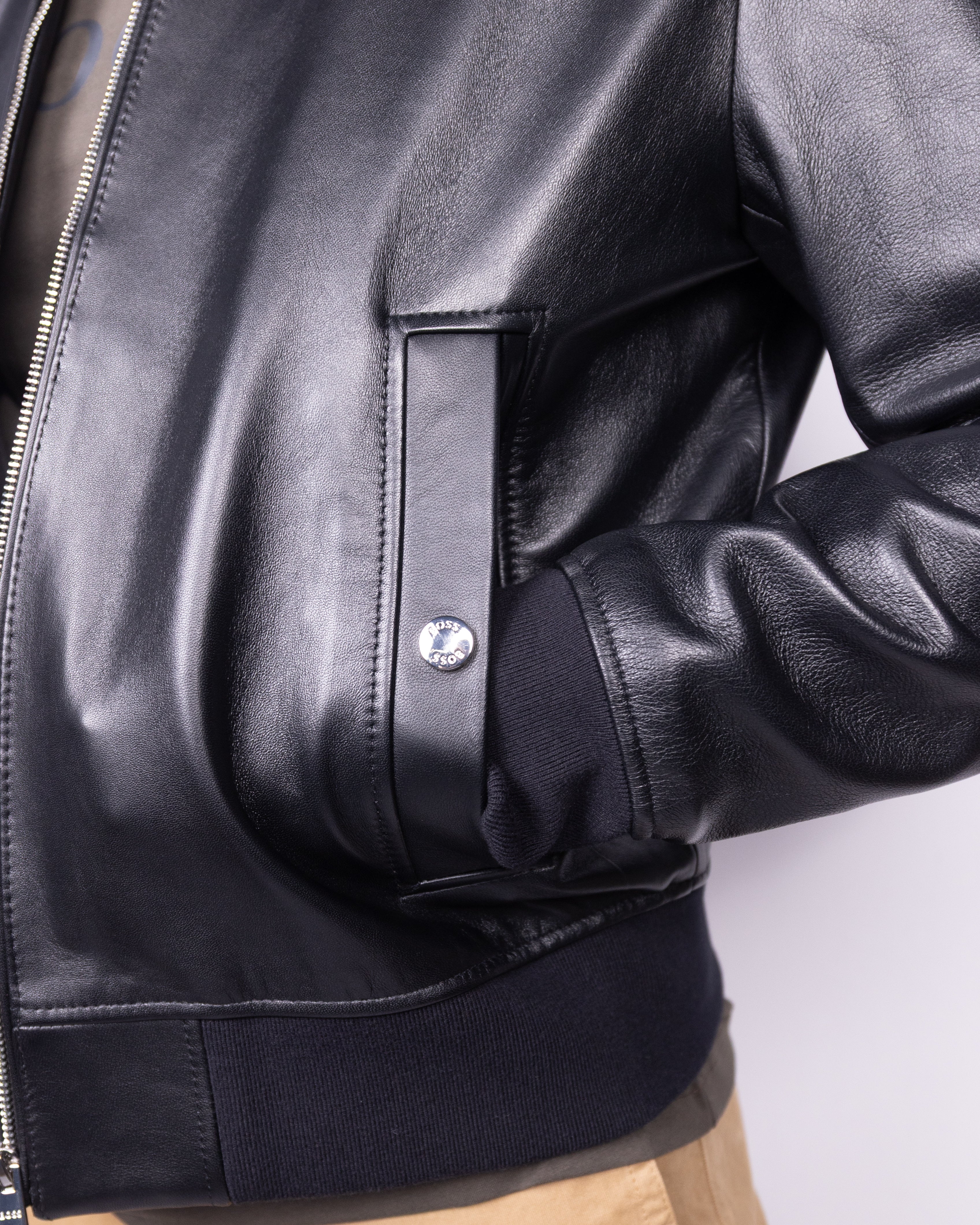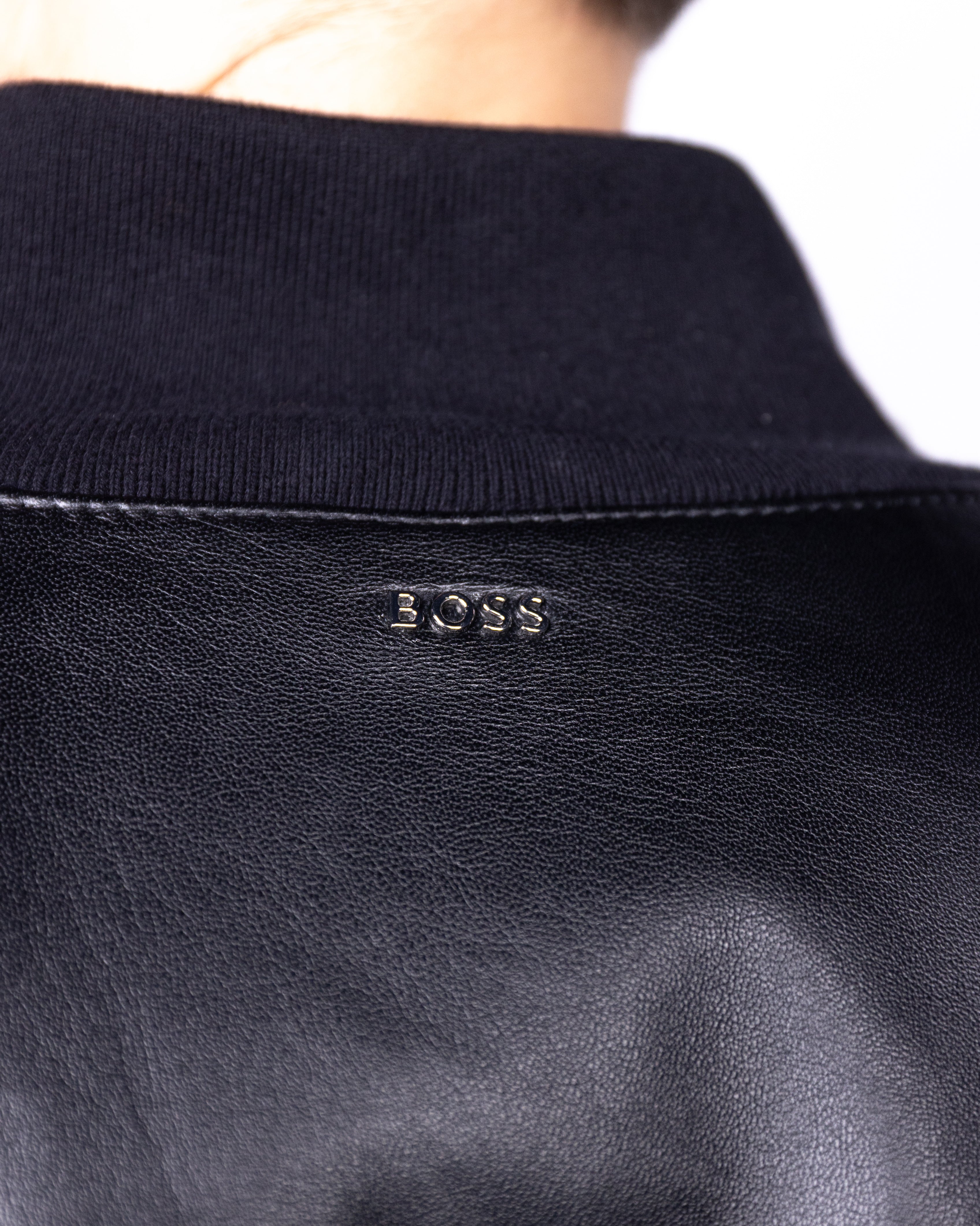 Bomber Lederjacke von BOSS in der Farbe Schwarz. Verfügbar in Grösse 50, 54. Ideal für stilbewusste Modefans, die hochwertige Markenmode zum Outletpreis in Basel suchen.